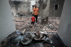 Egy apa gyermekével az erdőtűzben megsemmisült házuk belsejében Béjaia településen 2023. július 25-én. Az észak-afrikai országban összesen kilencvenhét erdőtüzet jelentettek, a heves szél szította lángok elérték a lakott településeket három megyében. A természeti csapásban eddig harmincnégy ember vesztette életét, ebből tíz katona. A sérültek száma huszonhat