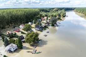A drónnal készült felvételen az áradás miatt vízben álló házak a Duna árterében, Vének üdülőövezetében 2024. szeptember 17-én