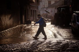 Árvíz utáni takarításra készül egy önkéntes a kelet-spanyolországi Valencia tartományban fekvő Massanassában 2024. november 8-án. Az özönvízszerű esőzések előidézte áradások miatt 217 ember életét vesztette Spanyolországban, a legtöbben Valencia tartományban.