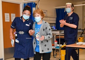 A kilencvenéves Margaret Keenant kikísérik, miután megkapta a Pfizer-BioNTech oltóanyag-kifejlesztő vállalatok koronavírus elleni vakcináját az angliai Coventry egyik kórházában 2020. december 8-án. Az Egyesült Királyságban ezen a napon megkezdték az új típusú koronavírus elleni tömeges oltási kampányt. Keenan volt az első páciens, akinek beadták az oltást