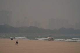 A kanadai erdőtüzek füstje homályosítja el Chicago épületeit a Michigan-tó felől nézve 2023. június 27-én, amikor az amerikai nagyváros levegőjét egészségtelennek minősítette az Egyesült Államok Környezetvédelmi Ügynöksége