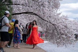 Virágba borult cseresznyefák alatt sétálnak turisták a Potomac folyó ártéri holtágának partján, Washingtonban 2025. március 30-án. A cseresznyefavirágzást az amerikaiak minden évben megünneplik azóta, hogy 1912. március 27-én Washington cseresznyefák ezreit kapta ajándékba Jukio Ozakitól, Tokió akkori polgármesterétől.