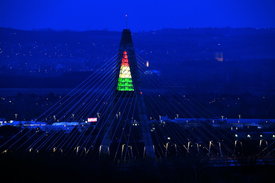 Nemzeti színű díszkivilágítás a Megyeri híd üvegezett részén az 1848–49-es forradalom és szabadságharc 176. évfordulója alkalmából 2024. március 15-én