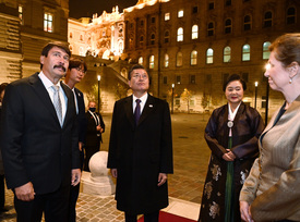 Mun Dzse In dél-koreai államfő (j3) és felesége, Kim Dzsong Szuk (j2), valamint Áder János köztársasági elnök (b) és felesége, Herczegh Anita (j) a Királyi Lovardában rendezett díszvacsora előtt 2021. november 3-án