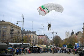 Ejtőernyős katona landol az 5. számú Bocskai István lövészdandár 70 éve a hazáért, 30 éve Debrecenért elnevezésű rendezvényén a Kossuth téren 2021. november 5-én