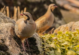 Csukárok (Alectoris chukar) Szrinagar nagyváros Sankaracsarja hindu templomának kertjében, Kasmír indiai fennhatóságú részén 2024. január 22-én. A fácánfélék családjába tartozó csukár Dél-Európában és Ázsia egy részén honos, talajon fészkelõ, mag- és rovarevõ madár
