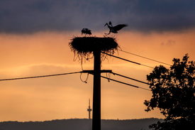 Gólyapár a fészkén, a Hesse tartománybeli Neu-Anspach kisvárosban 2023. július 12-én hajnalban