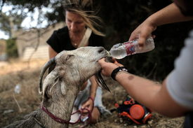 Erdőtűzben súlyosan megsérült kecskét itat egy állatvédő szervezet önkéntese