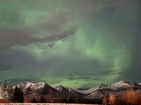 Az északi fény színezi zöldesre az égboltot a Chugach-hegység felett, az alaszkai Anchorage nagyváros közeléből fényképezve 2025. március 24-én