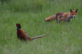 Fácánkakas (Phasianus colchicus) és vörös róka (Vulpes vulpes) a Pest vármegyei Csobánka környékén 2025. május 18-án