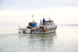Az 1971-ben gyártott Süllő II halászhajót vontatják a Balatonon, Keszthely közelében 2021. március 29-én. A hajót a vonyarcvashegyi önkormányzat hagyományőrzés céljából védelmébe vette, felújítás után a település kikötőjében állítják ki