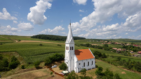 Drónfelvételen a magyar kormány támogatásával megújult református templom az erdélyi Felsődetrehemen a templomépület megújulásért tartott hálaadó istentisztelet napján, 2023. július 23-án