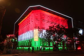 Nemzeti színű fényfestés a Terror Háza Múzeum homlokzatán az 1956-os forradalom és szabadságharc 66. évfordulóján, 2022. október 23-án