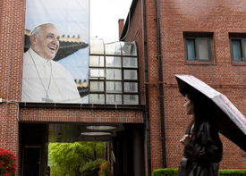 Ferenc pápa portréjánál megy egy dél-koreai nő a szöuli Mjongdong római katolikus székesegyháznál 2025. április 22-én