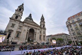 Résztvevők a Szent István-bazilikánál lévő kivetítőn nézik Ferenc pápa beszédét a püspökökkel, papokkal, diakónusokkal, szerzetesekkel, papnövendékekkel és lelkipásztori munkatársakkal rendezett találkozón a bazilikában 2023. április 28-án