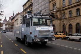 Korabeli rendőrségi jármű az 1990-es taxisblokád történéseit felelevenítő Blokád című film forgatásán a belvárosi Alkotmány utcában 2021. november 27-én