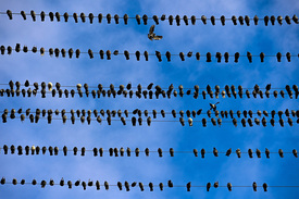 Villanyvezetékeken ülő galambok Debrecenben 2022. január 21-én