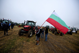 Bolgár parasztgazdák tüntetése az ukrán gabona behozatali tilalmának megszüntetése miatt Szófia környékén 2023. szeptember 20-án. A tömeges gazdatüntetések miatt a kormány korlátozza az ukrán napraforgómag importját