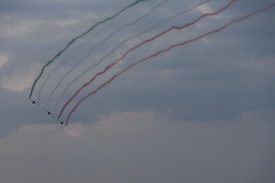 Budapest, 2022. augusztus 27. A Magyar Honvédség 59. Szentgyörgyi Dezsõ Repülõbázisa három Gripen vadászrepülõgépe kötelékben repülve nemzeti színû füstöt húz a Parlamentnél, a Duna felett 2022. augusztus 27-én.