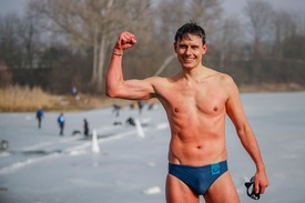 David Vencl cseh szabadmerülő bajnok ünnepel, miután Guinness-világrekordot állított fel a jég alatti leghosszabb úszásban a csehországi Teplice melletti Vapenka tóban 2021. február 23-án. David Vencl egy visszatartott lélegzetvétellel, védőöltözet nélkül, 80,9 métert úszott a 30 centiméter vastagságú jégréteg alatt. Vencl a dán Stig Severinsen 2013-ban 76,2 méterrel felállított rekordját múlta felül
