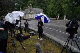 A sajtó képviselői II. Erzsébet brit királynő nyári rezidenciája, a skóciai Balmoral kastélyának bejáratánál 2022. szeptember 8-án. A királynő életének 97., uralkodásának 71. évében Balmoral kastélyában elhunyt. II. Erzsébet királynő édesapja, VI. György király halálának napján, 1952. február 6-án lépett az Egyesült Királyság trónjára. Halálának pillanatától elsőszülött fia, a 73 esztendős eddigi trónörökös, Károly a brit uralkodó