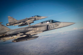 A Magyar Honvédség JAS 39 Gripen típusú vadászrepülőgépei gyakorló elfogást hajtanak végre Litvánia légterében 2022. szeptember 21-én. A magyar kontingens harmadik alkalommal védi a balti országok légterét.