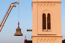 A drónnal készült felvételen daruval emelik ki a toronyból a veszprémi Szent Mihály-főszékesegyház nagyharangját 2024. október 30-án. Az ország legrégebbi, mintegy 3400 kilogrammos nagyharangját háromszáz év óta először mozdítják el helyéről, majd egy speciális módszerrel állítják helyre, amely így az visszanyerheti eredeti hangját