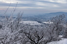 Budapest látképe a havazás után a Pilis hegységben található Nagy-Kevély felõl 2026. január 6-án
