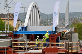 Helyére tolják a Szerémi út és az 1-es villamosvonal feletti új vasúti hidat Budapesten 2025. április 17-én. A 250 tonnás összeszerelt szerkezetet speciális technológiával kerül a helyére