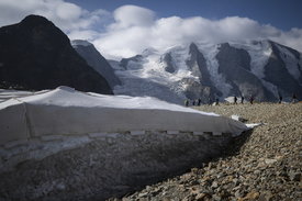 Pontresina, 2022. augusztus 10. Takaró borít egy sípályát a Bernina-hegylánc, valamint a Pers- és Morteratsch-gleccserek elõtt, a svájci Pontresinában 2022. augusztus 10-én. A forró nyár miatt feltehetõleg új csúcsot ér el a geleccserek olvadása.