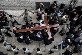 Keresztény hívõk fakeresztet visznek, amint végigjárják Jézus Krisztus keresztútját a Szent Sír-bazilikához vezetõ Via Dolorosán, a jeruzsálemi Óvárosban nagypénteken, 2021. április 2-án.