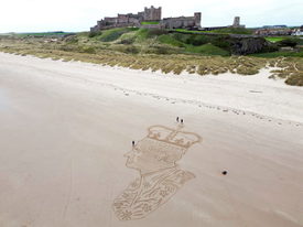 Claire Eason homokrajzművész az utolsó simításokat végzi 27,5 x 19,8 méteres, III. Károly brit királyt ábrázoló képén az északkelet-angliai Northumberland grófságban fekvő Bamburgh tengerpartján 2023. május 3-án. III. Károlyt május 6-án koronázzák meg a londoni Westminster-apátságban.