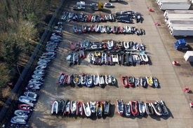 Légi felvétel a határsértõk által használt és a brit határvédelem által lefoglalt gumicsónakokról egy doveri raktár udvarán 2021. február 28-án.