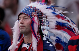 Amerikai szurkoló várja a katari labdarúgó-világbajnokság Anglia-Egyesült Államok mérkőzésének kezdetét az al-hori al-Bajt Stadionban 2022. november 25-én