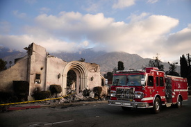 Erdőtűzben leégett templom a kaliforniai Altadenában 2025. január 17-én. A Los Angeleshez tartozó és a közelében fekvő településeken pusztító erdőtüzekben huszonnégy ember életét vesztette, több tucatot még keresnek, több mint tizenkétezer épület, főként lakóház pedig leégett
