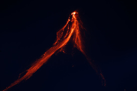 Izzó lávát bocsát ki a Mayon tűzhányó a Fülöp-szigeteki Albay tartományban fekvő Legaspiból nézve 2023. június 13-án. Az ország legaktívabb tűzhányójának kitörése miatt több mint 13 ezer embert telepítettek ki a környékbeli falvakból, további ezreket pedig figyelmeztették, hogy meneküljenek, ha erősödik a vulkán egyelőre még visszafogott tevékenysége