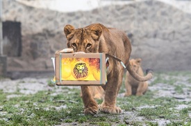 Karácsonyi díszdobozba rejtett napi húsadagját bontja ki egy nőstény afrikai oroszlán (Panthera leo) a Nyíregyházi Állatparkban 2020. december 23-án