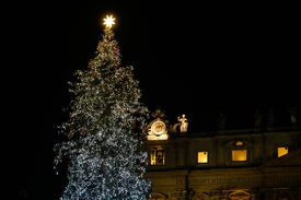 Vatikánváros, 2022. december 3. A Vatikán 26 méter magas, 62 éves ezüstfenyõje a Szent Péter-székesegyház elõtti téren 2022. december 3-án, a karácsonyfa fényeinek felkapcsolása után.