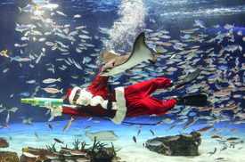 Mikulásruhába öltözött búvár eleséggel vonzza magához a halakat a tokiói Sunshine Akváriumban 2023. december 14-én.