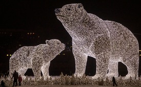 A karácsonyi és az újévi ünnepek alkalmából kivilágított, hatalmas jegesmedveszobrok előtt sétálnak emberek Moszkva belvárosában 2020. december 14-én. Szergej Szobjanyin polgármester bejelentette, hogy a koronavírus-járvány miatt az idén nem tartják meg az újévi ünnepségeket az orosz fővárosban