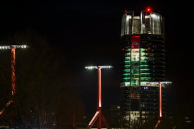 A MOL Campus karácsonyi fénykivilágításban 2023. december 17-én. A 11. emelettől a 28. emeletig 278 ledlámpa öltözteti zöld és sárga fényekbe az épületet minden adventvasárnap