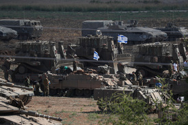 Izraeli katonák harckocsikkal és páncélozott járművekkel Dél-Izraelben, a Gázai övezet határának közelében egy gyülekezési ponton 2023. október 14-én. A Gázai övezetet irányító Hamász palesztin iszlamista szervezet október 7-én többfrontos támadást indított Izrael ellen, ahol 1300 ember életét vesztette, a Hamász elleni izraeli válaszcsapások 2215 palesztin halálát okozták a Gázai övezetben