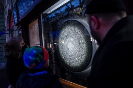 Sztojánovits Andrea fényművész, főiskolai docens FÉSZEK című interaktív fényinstallációja egy Piac utcai kirakatban Debrecenben 2021. február 5-én. A Lighthouse fényművészeti csoport a koronavírus-járvány miatt egy korábban pékségként üzemelő, üres üzlethelyiséget avatott alkalmi kirakatgalériává. A kiterjesztett valóság médiumát használva a járókelők saját mobiltelefonjuk segítségével kelthetik életre a virtuális látványrétegeket, amelyekhez audio kompozíció is társul