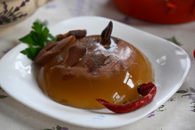 A kocsonyafőző versenyre benevezett különlegesség a 10. alkalommal megrendezett Forraltbor- és kocsonyapikniken Vácrátóton, a Petőfi téren 2025. január 25-én