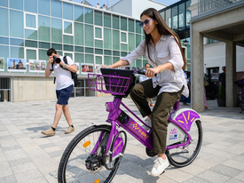 Szentkirályi Alexandra kormányszóvivő kerékpározik a V-Bike közbringarendszer egyik elektromos biciklijén a veszprémi ActiCity Tánc- és Mozgásművészeti Központnál 2023. július 11-én