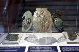 A kiállított díszpáncél a Római díszpáncél a Dunából című kamaratárlat sajtótájékoztatóján a Magyar Nemzeti Múzeum Lapidáriumában 2021. november 10-én. Egy értékes régészeti lelettel, egy magángyűjtőtől 2,65 millió forintért megvásárolt teljes és ép római katonai lófejpáncéllal gyarapodott a Magyar Nemzeti Múzeum Régészeti Tárának Római Gyűjteménye. A Duna komáromi szakaszából fél évszázada kiemelt páncélnak mindhárom eleme megőrződött. Ilyen ép állapotú vértet már több mint hetven éve nem találtak a Római Birodalom területén.