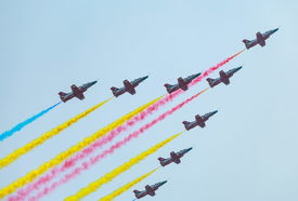 A Vörös Sas műrepülőcsoport Nancsang JL-8 típusú kiképzőgépekkel repül alakzatban a 15. alkalommal rendezett kínai nemzetközi légiipari kiállításon a dél-kínai Kuangtung tartománybeli Csuhajban 2024. november 12-én, a hatnapos nemzetközi expó kezdőnapján