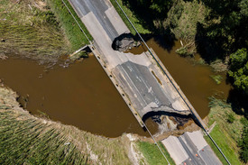 A heves esőzés miatt megáradt Rinya-patak leszakadt hídja a 68-as főút Böhönye és Segesd közötti szakaszán 2020. július 27-én.