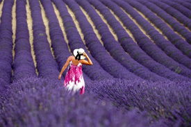 Levendulamezőn sétál egy nő a dél-franciaországi Provence régióban Valensole-ban 2023. július 7-én. A levendula június és augusztus között virágzik, kivonatait parfümökhöz, szappanokhoz és gyógyszerészetben használják.