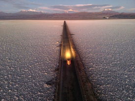 Az Atacama-sósivatagon keresztül vezető úton, az Albemarle lítiumbánya közelében halad egy autó 2023. április 17-én